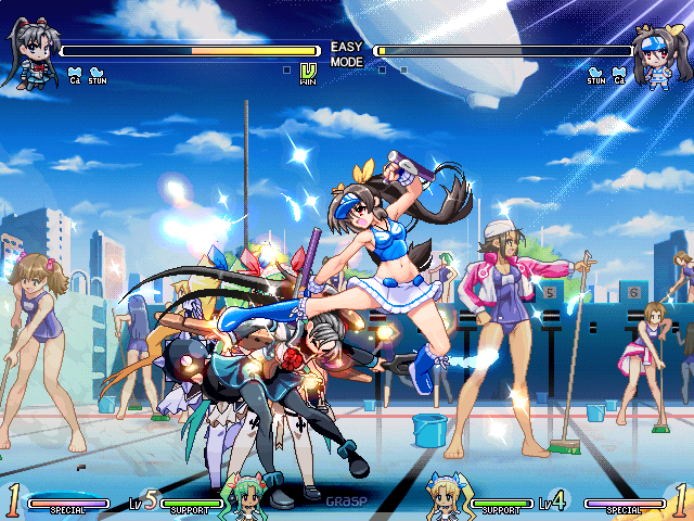 Et bien je me trompais ! En effet le jeu m’a presque fait tombé par terre par sa réalisation ! (si si quand on s’attend a un jeu pourris et qu’on se récupère un truc pareil sa s’appel prendre un coup d’boule graphique !) Non seulement les sprites sont grands et détaillés mais en plus leur animation est juste excellente ! Mais ce n’est pas tous puisque le jeu est FUN ! En effet au niveau des mouvement et des attaques il ne manque rien des élément qui font les meilleurs jeux de combat 2D (chop, rétablissement aérien, attaques spécial…) Le tous servit avec des animation aux petit oignons a la fluidité parfaite. Et cerise sur le cake l’humour manga dans les mimique des personnage est aussi là ! ^^
