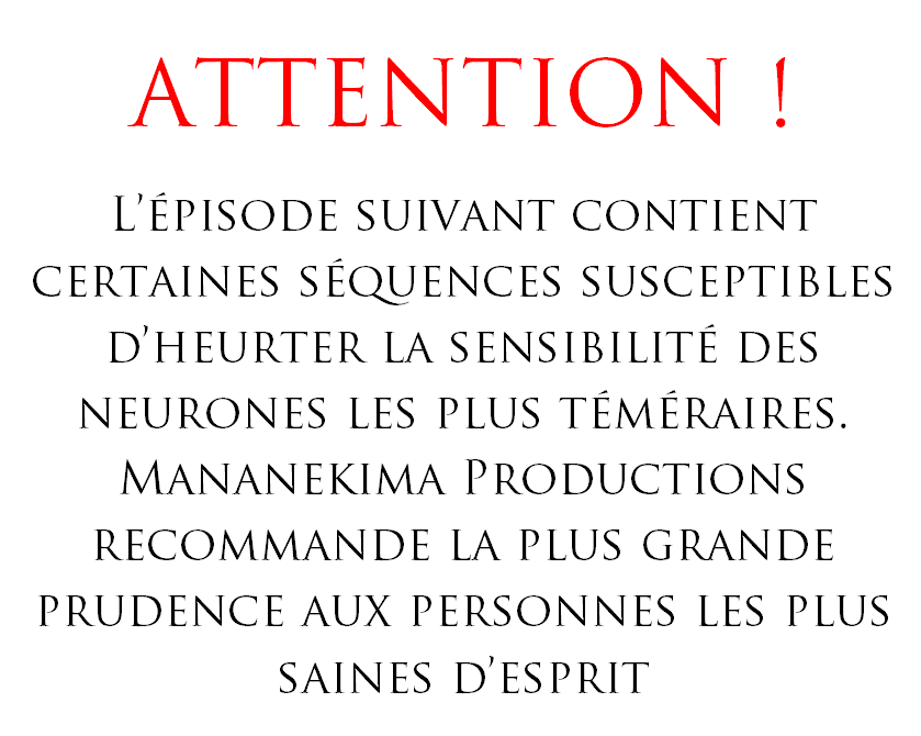 Et l’épisode 6… Ah la la la, l’épisode 6 mon dieu… Une catastrophe mentale incroyable! Vous m’y entendrai passer par toute les étapes de l’agacement à la colère et même au-delà puisqu’à la fin je suis littéralement devenu fou. Mes commentaires partent complètement en couille et je fait n’importe quoi… Un très grand moment! Je n’ai jamais de ma vie atteint un tel niveau de n’importe-quoi-isme et personnellement je trouve ça très drôle ^_^ Barricadez vos neurones ils vont en prendre un sacré coup!
